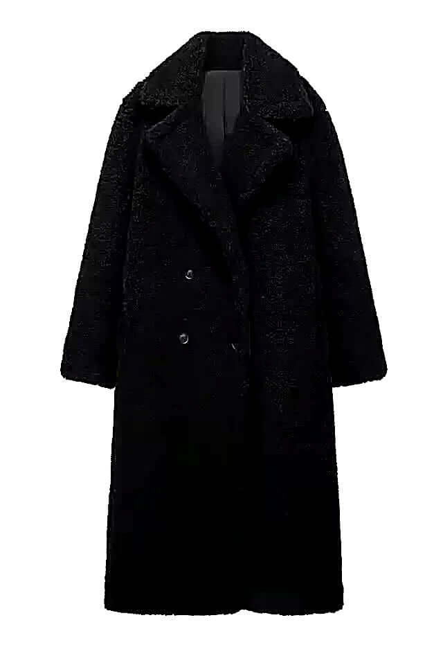 Elegant oversized winter coat featuring a chic black design with a double-breasted front and oversized fit.