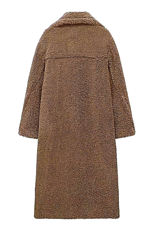 elegant oversized winter coat in soft brown texture with oversized fit and classic lapel design.