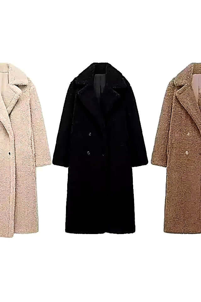 Elegant oversized winter coat in three colors: beige, black, and brown, showcasing luxurious design and warmth.
